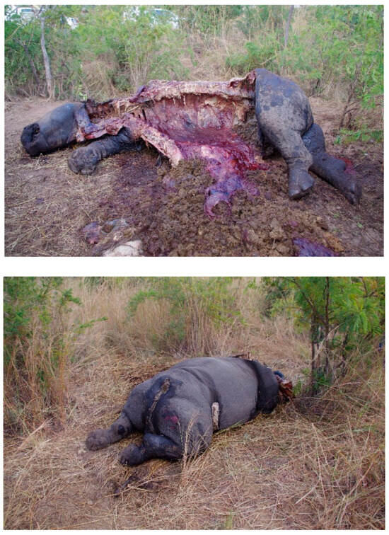 Poached female Rhinoceros (upper) with her baby (lower) hunted for the horn (photo taken at Kruger NP, South Africa, 2016).
