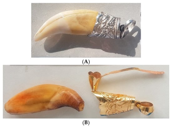 (A) Tooth of P. tigris mounted in silver. (B) Tooth of Ursus thibetanus mounted in gold.