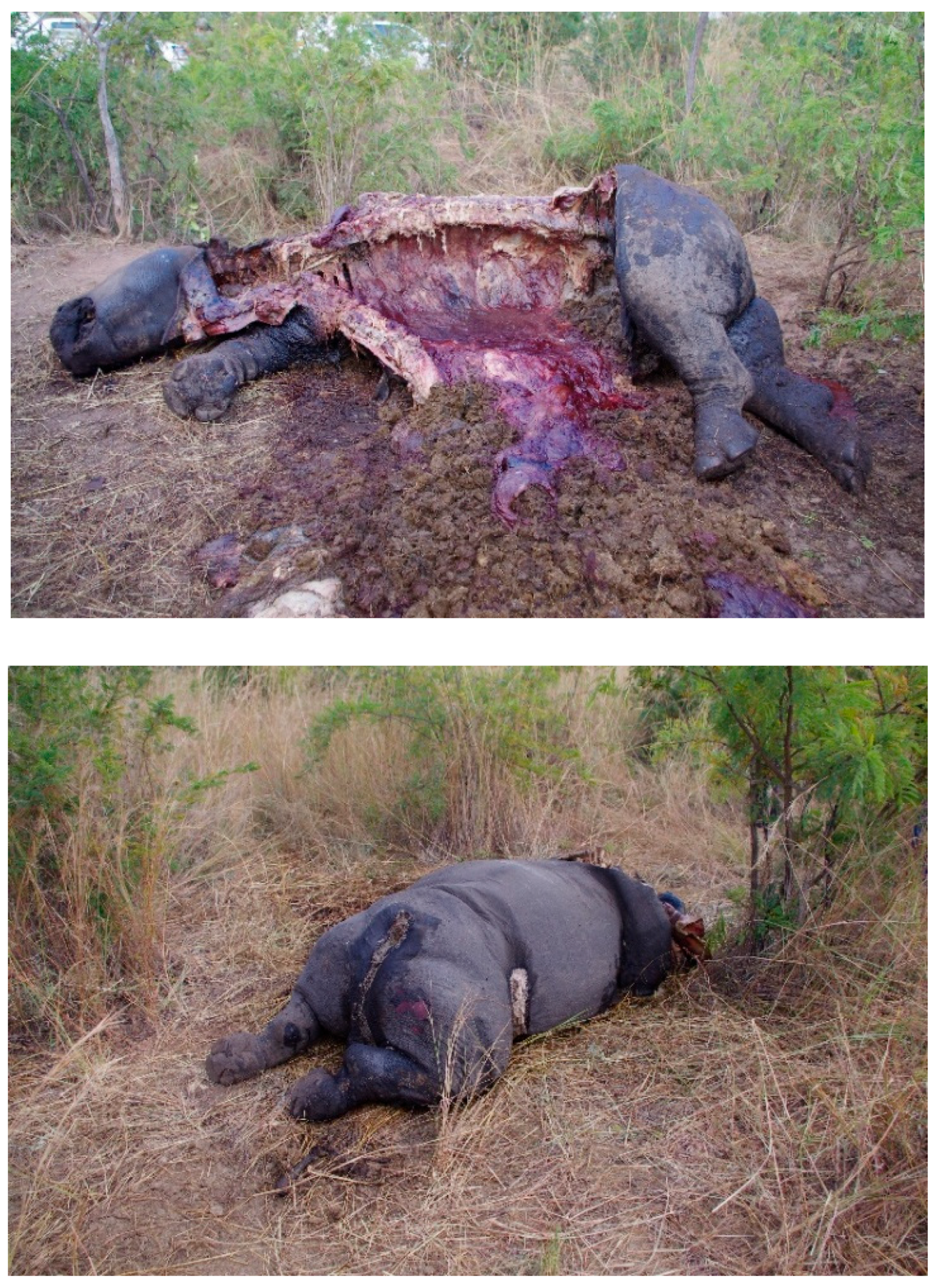 - Harper, C.; Ludwig, A.; Clarke, A.; Makgopela, K.; Yurchenko, A.; Guthrie, A.; Dobrynin, P.; Tamazian, G.; Emslie, R.; Van Heerden, M. Robust forensic matching of confiscated horns to individual poached African rhinoceros. Curr. Biol. 2018, 28, R13–R14. [Google Scholar] [CrossRef]