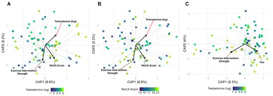 However, significant interactions emerged when examining combined factors. Exercise and testosterone showed synergistic effects on both abundance-based (Bray–Curtis: R2 = 0.037, p = 0.049) and membership-based (Sorenson: R2 = 0.041, p = 0.012) (Figure 5A) community metrics. Additionally, E2 carrier status modified the testosterone effect on community membership (Sorenson: R2 = 0.022, p = 0.046). MoCA scores showed a trending association with community composition (Sorenson: R2 = 0.020, p = 0.056) (Figure 5B), and salivary testosterone levels showed a suggestive association (R2 = 0.019, p = 0.103) (Figure 5C). These beta diversity patterns suggest that while individual factors may have limited effects on overall community structure, their interactions create distinct microbial signatures. The stronger effects on Sorenson (presence/absence) versus Bray–Curtis (abundance-weighted) distances indicate that hormonal and exercise factors primarily affect which bacteria are present rather than their relative abundances.
