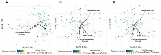 Exercise and APOE genotype interact with testosterone to shape microbial community structure. (A) Community structure by exercise and testosterone (Bray–Curtis). The exercise-by-testosterone interaction is significant (R2 = 0.037, p = 0.049). Points are filled by log-transformed testosterone levels and shaped by exercise modality (circle/square/triangle). Faint spider segments connect points to their exercise-modality centroids; centroids are drawn as larger versions of the same shape. Covariate vectors indicate the strongest drivers of ordination axes, where red dotted lines connect covariate vector labels to their corresponding vectors. (B) Community structure by exercise and testosterone (Sorenson). The exercise-by-testosterone interaction is significant (R2 = 0.041, p = 0.012). Same styling as in (A). (C) Community structure by APOE genotype and testosterone (Sorenson). The APOE-by-testosterone interaction is significant (R2 = 0.022, p = 0.046). Same styling as in A with APOE genotype shaping instead of the exercise group.