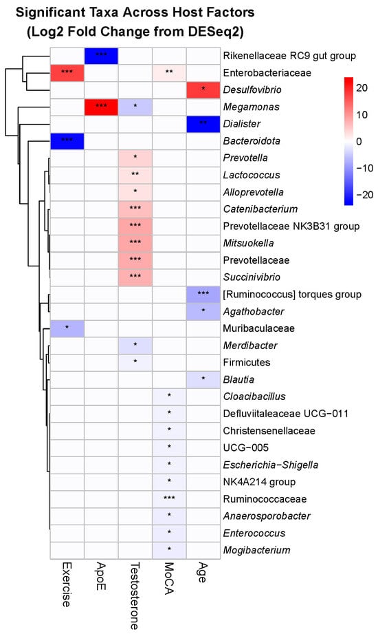 Host factors associate with distinct bacterial taxon relative abundances. Significant taxa (FDR-corrected p < 0.05) were identified across host factors: exercise (3 taxa), ApoE genotype (2 taxa), testosterone (11 taxa), MoCA score (11 taxa), and age (5 taxa). Rows represent significant taxa (genus-level); columns are host factors. Values are DESeq2 log2 fold changes; cells display significance with asterisks (* p < 0.05, ** p < 0.01, *** p < 0.001). To improve legibility, very small but significant effects are visualized with a minimum color intensity so that all significant cells appear non-white, while non-significant effects remain white (0). Row labels prioritize genus (or else family or phylum when genus annotations are not available) for readability; color breaks are symmetric about zero.