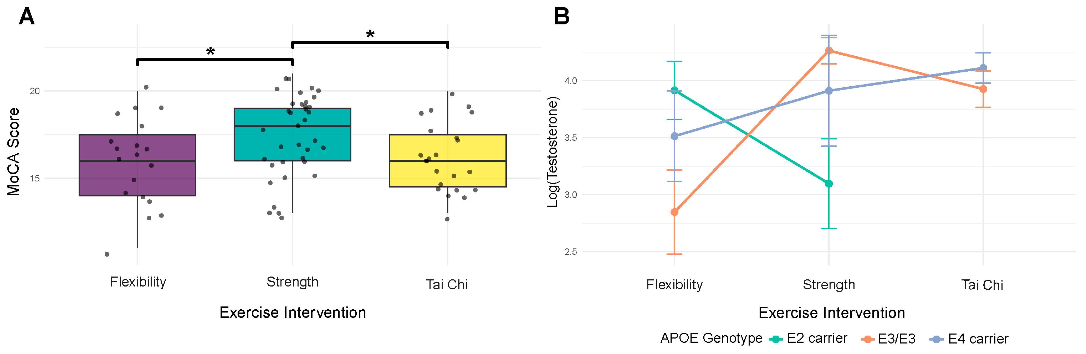 Raber, J.; O’Niel, A.; Kasschau, K.D.; Pederson, A.; Robinson, N.; Guidarelli, C.; Chalmers, C.; Winters-Stone, K.; Sharpton, T.J. Exercise, APOE Genotype, and Testosterone Modulate Gut Microbiome–Cognition Associations in Prostate Cancer Survivors. Genes 2025, 16, 1507. https://doi.org/10.3390/genes16121507
