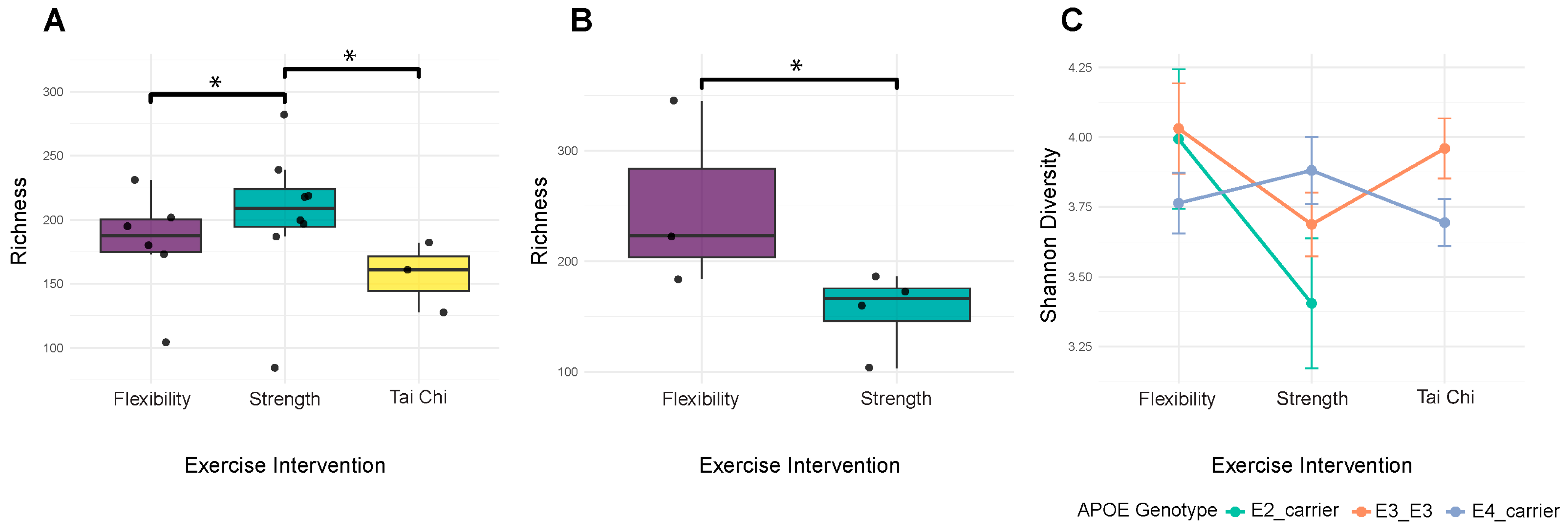APA StyleRaber, J., O’Niel, A., Kasschau, K. D., Pederson, A., Robinson, N., Guidarelli, C., Chalmers, C., Winters-Stone, K., & Sharpton, T. J. (2025). Exercise, APOE Genotype, and Testosterone Modulate Gut Microbiome–Cognition Associations in Prostate Cancer Survivors. Genes, 16(12), 1507. https://doi.org/10.3390/genes16121507