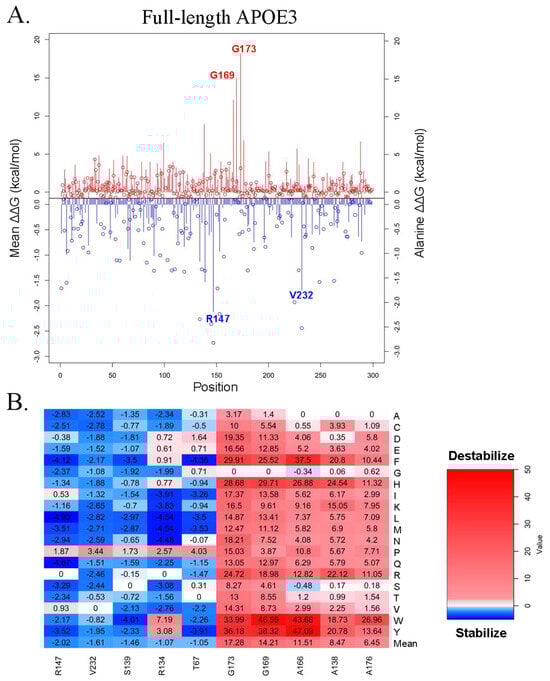 The saturated mutagenesis of full-length APOE3 (2L7B) yielded 5681 missense mutations. Out of the 5681 missense mutations, 3723 (65.53%) were destabilizing, and 1958 (34.47%) were stabilizing (Supplementary Table S3), comparable to the percentages observed for APOE3 (1NFN) and APOE4 (1GS9). Similar to Figure 2C,D, the mutation sites shown at the bottom of Figure 3B were selected because they exhibited the highest mean ΔΔG values (kcal/mol) among all the sites analyzed. We chose to highlight mutations G173, G169, R147, and V232 in Figure 3A because these were among the top mutation sites (based on their mean ΔΔG values) identified in the full-length APOE3 (2L7B) structure. While the exact top residues differed from the N-terminal models, the enriched regions were similar. Several of the most destabilizing 2L7B sites (G173, G169, and A166) cluster near the helix-4/hinge boundary and are adjacent to the APOE4 hotspot G165 in 1GS9. L155 (highlighted in both N-terminal structures) falls within the same neighborhood. Conversely, A138 is within the canonical LDL-receptor binding region (~135–150), aligning with L148 in APOE4. The top 2L7B destabilizing hits localize to the N-terminal domain or hinge region (e.g., G173, G169, A166, and A176), consistent with our N-terminal analyses. Note that 2L7B is an engineered non-lipidated model containing five C-terminal stabilizing mutations, which could dampen apparent CTD sensitivity and bias extremes toward the NTD/hinge region. Among stabilizing predictions, all but one (V232) occur in the NTD (e.g., R147, S139, and R134). These residues lie near stabilizing features seen in 1NFN/1GS9 (e.g., D151 and G120), and several (S139 and R147) fall within the LDLR-binding epitope window. In 2L7B, aromatic substitutions at hinge-proximal Gly/Ala residues exhibited the largest predicted destabilizations, which include A166Y (47.09 kcal/mol), G169W (46.59 kcal/mol), A166W (43.68 kcal/mol), G169Y (38.32 kcal/mol), G173Y (36.18 kcal/mol), and G173W (33.99 kcal/mol). These values reflect model-based predictions rather than experimental free energies and should be interpreted as relative effect sizes.