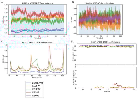 APOE3 (1NFN) and mutants: RMSD, Rg, RMSF, and DSSP. (A) RMSD vs. time. (B) Radius of gyration (Rg) vs. time. (C) RMSF per residue. (D) DSSP secondary structure: helix (top) and β-sheet (bottom) vs. time. All traces are from the production window 36.2–100 ns, which excludes early transients and captures post-equilibration behavior. Per-frame DSSP strings were parsed, with helix defined as H + G + I (DSSP labels H: α-helix; G: 310-helix; I: π-helix) and β-sheet defined as E + B (DSSP labels E: extended β-strand; B: isolated β-bridge). Values were converted to percent per frame using the number of residues present and then smoothed with a 1.0 ns moving average. Helix traces overlap at ~78–82% across variants. β -sheet content is ~0% for WT, M108W, and D107L, with brief transients up to ~1–1.5% for L155W and D151F. RMSD/RMSF indicates that D151F is the most perturbed, while L155W trends slightly more compact by Rg. (Panels share consistent coloring across metrics.).