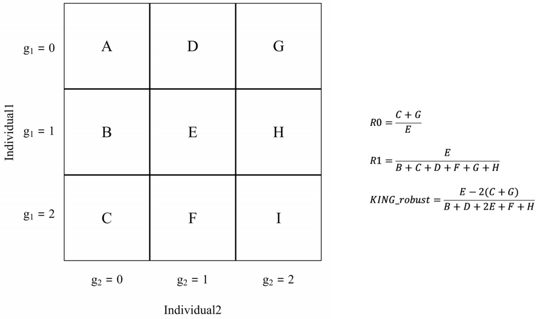 Figure 1). The three statistics are originally defined as follows: (1) the proportions of genomic regions in which two individuals share either 0 or 1 allele that is IBD, and (2) kinship coefficients conceptualized through the formulation