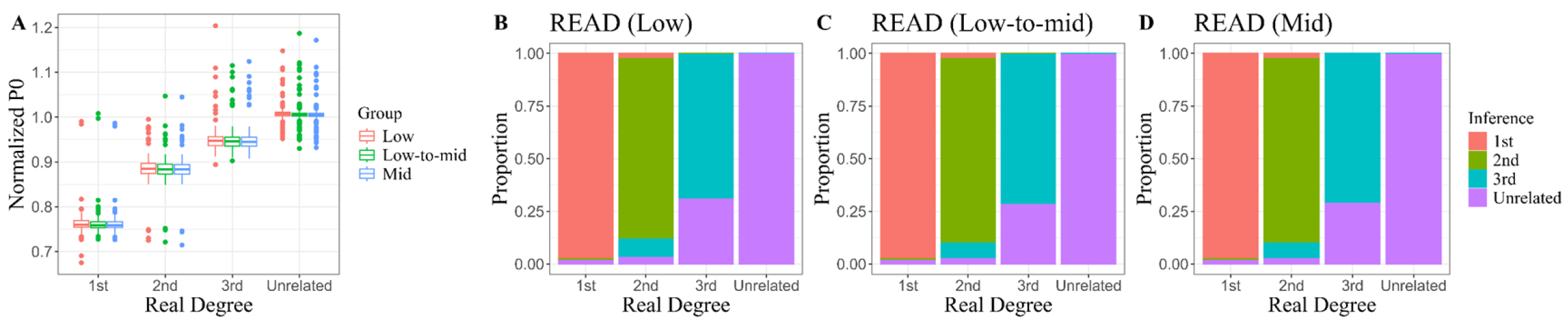 READv2.0 allows users to specify a median mismatch rate derived from extensive genomic data of unrelated individuals with similar hereditary backgrounds to those of the test individuals. If not specified, the program defaults to using the median P0 estimated from the input samples for normalization. However, given that over 50% of all analyzed target individual pairs were unrelated, employing default values offers a more efficient procedure while ensuring negligible bias as reported by the developers.