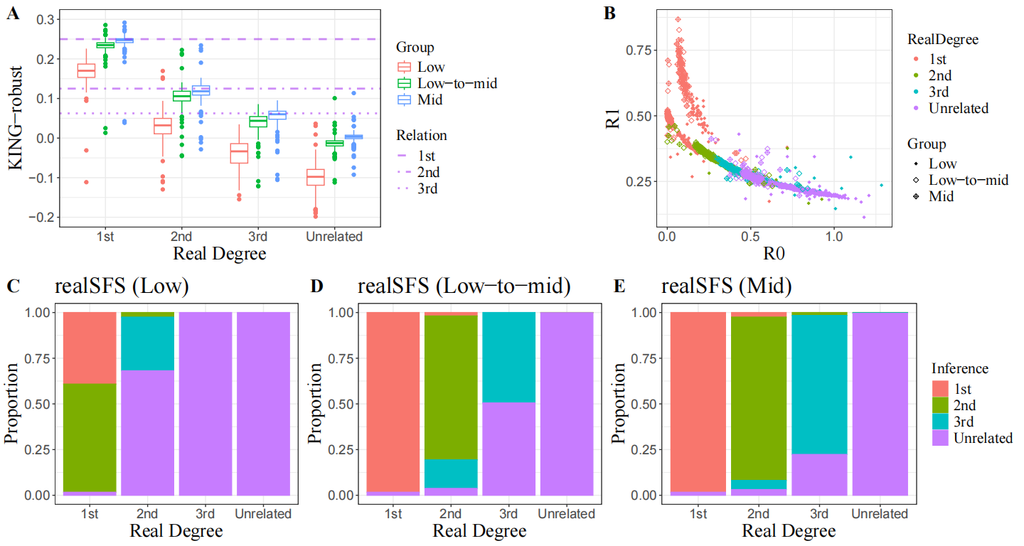 Statistical analyses of outputs generated by the aforementioned software packages were implemented using R programming language version 4.0.0. We primarily focus on three metrics in our evaluation: accuracy, false positive rate and false negative rate. Accuracy is calculated as the proportion of individual pairs for which the inference aligns with ground truth relative to the total pairs subjected to inference. The false positive rate is defined as the proportion of pairs of unrelated individual pairs that are incorrectly classified as close relatives (up to the 3rd degree). Conversely, the false negative rate is defined as the proportion of true close relatives that are incorrectly classified as unrelated. Figures illustrating result were primarily created using the ggplot2 library version 3.5.1.
