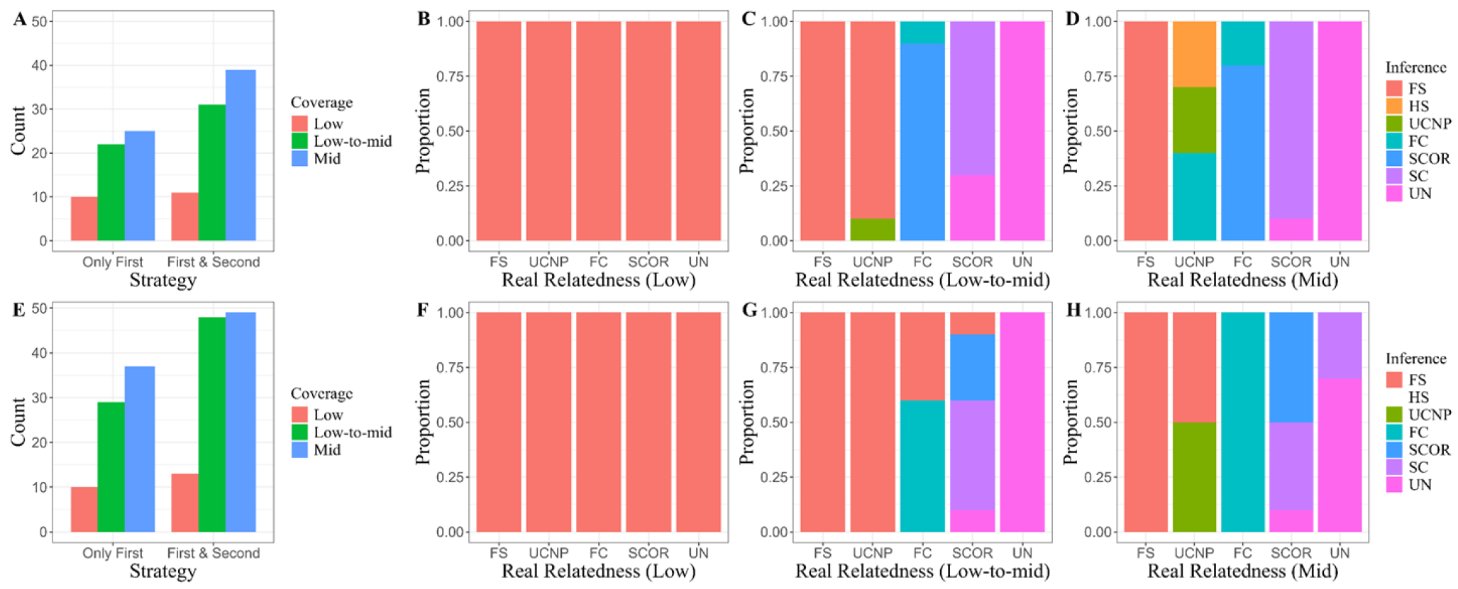 20]. Conversely, another investigation incorporating the NgsRelate method demonstrated that algorithms based on genotype likelihood exhibit a higher minimum coverage tolerance threshold—approximately 1×—compared to those relying on pseudo-haplotype mismatch [
