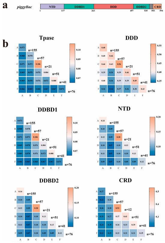 Heatmap visualization of sequence conservation across transposon clades A–F. (a) Schematic representation of piggyBac (PB) transposase domains. (b) Numerical values indicate mean percentage identity derived from pairwise comparisons of full length of transposase (Tpase) and distinct structural domains. Catalytic domain (DDD), N-terminal domain (NTD), Dimerization and DNA binding domain 1 (DDBD1), Dimerization and DNA binding domain 2 (DDBD2), and C-terminal cysteine-rich domain (CRD). Values were computed through comprehensive alignment of corresponding domain sequences between clade pairs. The numerical values in the heatmap represent the sequence similarity of domains within a single clade or between two different clades. Lower similarity is shown in blue, while higher similarity is shown in orange. The value of n indicates the number of sequences from each clade used in the calculation.