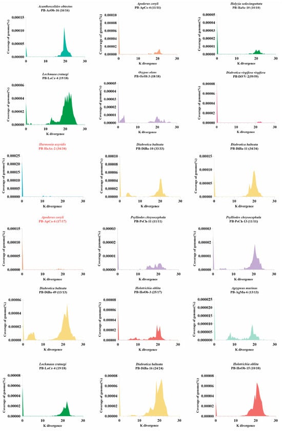 Our data mining revealed that intact PB copies were identified in all PB-detected species, suggesting that some PB transposon copies represent recent invasions and may reflect ongoing or current activity in these genomes. The Kimura divergence of PB transposons were estimated for some species containing putatively active PB (intact copies > 50% and total intact copies > 10) using Kimura divergence (K) values [39] as described in Methods. Our analysis demonstrated that most PB transposons exhibit very young insertion ages (K ≈ 0), suggesting recent genomic invasions and potential transposition activity (Figure 4 and Supplementary Figure S1). Interestingly, both young and old PB transposons coexist in several species, including Diabrotica balteata (Diba), Apoderus coryli (Apco), indicating recurrent PB transposon invasions in these genomes. Some genomes appear to represent long-term and persistent invasions of PB transposons (Figure 4), such as PB-HoOB-3, PB-HoOB-15, PB-HoOB-28 in Holotrichia oblita (Hoob), PB-LoCr-4 in Lochmaea crataegi (Locr), PB-DiBa-5, PB-DiBa-26 in Diabrotica balteata (Diba). Notably, PB transposons appear to be currently active in certain species, particularly those containing elements with both extremely young insertion ages (K ≈ 0) and 100% intact copies. Prominent examples include: PB-HaAx-2 in Harmonia axyridis (Haax), PB-ApCo-6 in Apoderus coryli (Apco), and PB-DiBa-3 in Diabrotica balteata (Diba) (Figure 4 and Supplementary Figure S1). These elements represent excellent candidates for developing new gene transfer tools due to their recent activity and high integrity.