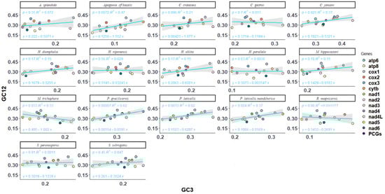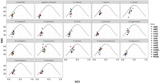 The MITOS web server http://mitos2.bioinf.uni-leipzig.de/index.py (accessed on 25 September 2017) [23] and tRNAscan-SE v1.3.1 [24] were utilized for predicting the secondary structures of tRNAs. Base compositions, codon usage, and relative synonymous codon usage (RSCU) were analyzed using MEGA v.7.0 [25] and graphically represented using ggplot2 packaging in R. The strand asymmetry was calculated using the formulas: AT-skew = (A − T)/(A + T) and GC-skew = (G − C)/(G + C) [26]. Factors influencing codon usage bias were analyzed using ENC-plot and neutrality plot analysis. The formula for calculating the expected ENc value is: ENC = 2 + GC3s + 29/[GC3s2 + (1 − GC3s)2]. A lower ENC value indicates a stronger influence of GC3s on codon usage bias, while a higher ENC value suggests a stronger impact of natural selection on gene evolution [27]. The neutrality plot plots GC12 (average of GC1 and GC2) against GC3, and the correlation between GC3 and GC12 reflects the influence of base mutations on codon usage bias. A stronger correlation indicates a greater impact of base mutations, while a weaker correlation suggests a higher influence of selection pressure. The analysis was performed using MEGA v.7.0 [25] to calculate the GC1, GC2, and GC3 values for each codon.
