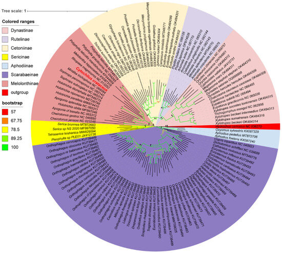 C. crataceus (Niijima & Kinoshita, 1923) [1], belongs to Melolonthinae, Scarabaeidae, and Coleoptera. Scarabaeidae is a large group of insects within Coleoptera. Based on their feeding habits, beetles can be divided into two branches: coprophagous and phytophagous (including saprophagous). C. crataceus is a phytophagous beetle reported to damage the leaves and roots of oil tea plants. It is mainly distributed in the mid to low-altitude mountainous regions south of China and bears a striking resemblance to Cyphochilus taipeiensis. Research on C. crataceus has mainly focused on synthesizing high-performance materials by mimicking the iridescent scales of the beetle, while its distribution and harmful effects remain unclear. Since Erichson [2], phytophagous beetles have been named Pleurosticti and are considered an independent branch, receiving affirmation from morphological studies, including Melolonthinae, Cetoniinae, Dynastinae, and Rutelinae as the four subfamilies [3,4]. However, the taxonomy and phylogeny of Melolonthinae are still controversial. Based on morphological characteristics, multi-gene sequences, and mitochondrial genome analysis, Melolonthinae is supported as a monophyletic group [5,6,7]. Nevertheless, some authors have proposed merging Melolonthinae, Rutelinae, and Dynastinae into the family Melolonthidae [8,9]. There is also debate on whether Sericinae should be considered as a tribe within Melolonthinae [5,6,10]. Clarifying the status of subgroups within the family Melolonthinae may help understand their evolution and aid in future classification work; thus, it is necessary to integrate existing data for a more comprehensive reconstruction of the phylogenetic tree of Scarabaeidae.