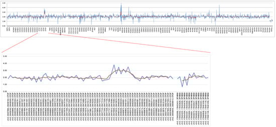 Copy number analysis results using short-read NGS read depth data. The upper panel indicates the all-target genes’ copy numbers and the lower panel indicates the target genes’ copy numbers on chr 2. Blue line indicates the estimated copy number for each amplicon and red line indicates the smoothing value for five relative amplicons.