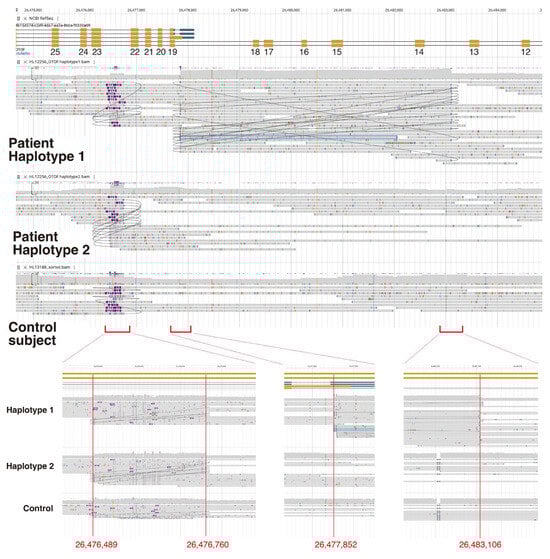 Interestingly, a copy number gain ranging from 26,476,489 to 26,476,760 was observed in both haplotypes (Figure 3). We therefore estimated this duplication to be a non-pathologic structural variant observed in the Japanese population. We also analyzed the long-read NGS data for some control subjects and confirmed that this CNV was also observed in the controls (Figure 3). Thus, the 271-base duplication between chr2: 26,476,489 and 26,476,760 located in the intronic region is thought to be a non-pathogenic CNV, which is not observed in the reference human genome GRCh38.p5.