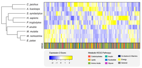 Expression profiles of metabolic genes in primate V1s. Clustering of expression profiles of 1039 metabolic genes in primate V1s. Highly correlated genes (columns) cluster together, and samples (rows) cluster based on the Euclidean distance between expression values. Only species for which there were greater than one sample per species were used. Averages of expression per gene were calculated across replicates per species. The bottom bar represents membership in the color-coded KEGG metabolic pathways for each gene in the heatmap.