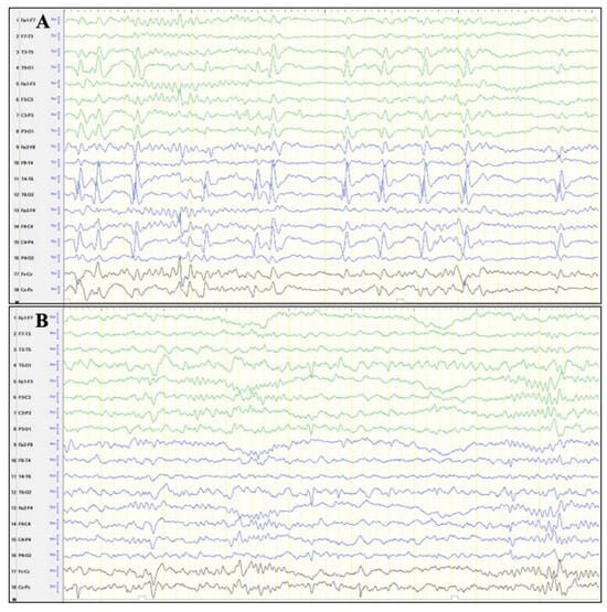 An electroencephalogram (EEG) (Nihon Kohden, Neurofax EEG-1200K; Zagreb, Croatia) with a sampling rate between 200 and 10,000 Hz was performed to evaluate electrical brain activity. The patient’s forehead was cleaned with an alcohol swab before electrode placement to maintain the impedance of each electrode channel below 5 kΩ. According to FPz-F9 and FPz-AF7 of the international 10–20 system, electrodes were placed in a bipolar longitudinal montage and encompassed the brain of the same hemisphere.