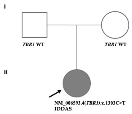 The family pedigree of the patient with the NM_006593.4(TBR1):c.1303C>T variant (I, II). Circles and squares denote female and male family members, respectively. The arrow shows the proband. The gray filling color represents IDDAS (intellectual developmental disorder with autism and speech delay). The TBR1 genotype status for each participant is given under the circles or squares.