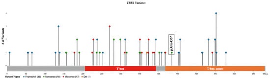 The NM_006593.4(TBR1):c.1303C>T variant is located in exon 6. In ClinVar and the published literature, there are 72 reported pathogenic or likely pathogenic TBR1 variants to date (21 December 2024) [2,14,23]. In total, 18 of these 72 variants are nonsense and 35 are frameshift. Given the pLI score of one, TBR1 is considered intolerant to LoF. Therefore, variants that introduce a premature stop codon are expected to have a deleterious effect on proteins [14] and contribute to the mechanism of disease [2]. Of the pathogenic or likely pathogenic variants reported in ClinVar and the literature, 22 are located in exon 6, similar to our variant (Figure 3). No significant differences were observed in the type or severity of the clinical findings based on the variant’s location along the gene [14].