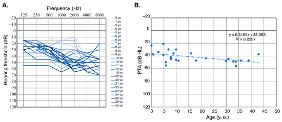 (A): Overlapping audiograms from this report and all previous reported cases. Ages ranged from 0 to 36 yo (mean 14.9 yo), with older patients shown in darker colors. (B): Detailed progression analysis of hearing deterioration for patients with OTOGL-associated HL. Each dot indicates the pure-tone average (PTA; average of hearing thresholds for 500 Hz, 1000 Hz, 2000 Hz, and 4000 Hz) and age of each patient. Dotted line indicates the linear regression.