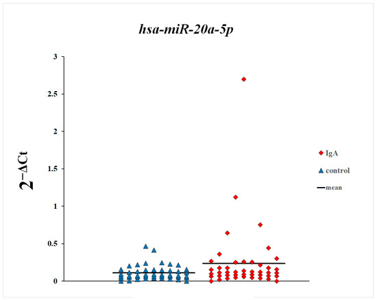Plasma levels of miR-20a-5p in patients with IgA nephropathy and control subjects.