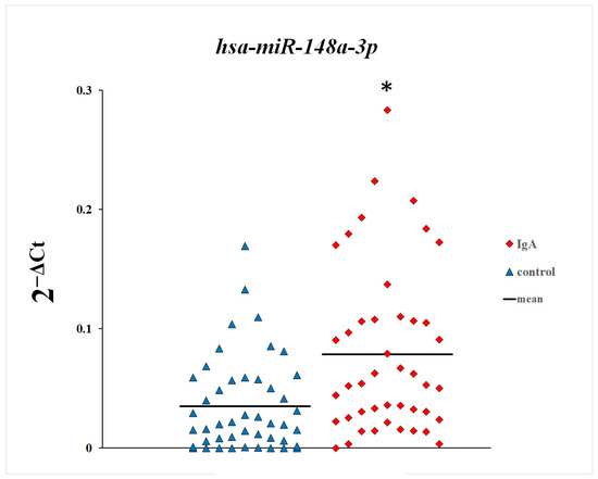 Plasma levels of miR-148a-3p in patients with IgA nephropathy and control subjects. * p = 0.0002, Mann–Whitney U test.