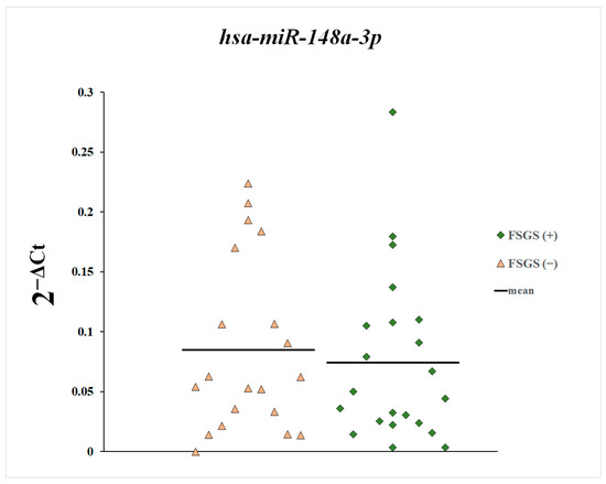 Next, we compared the plasma levels of miR-148a-3p, miR-425-3p, and miR-20a-5p between patients with and without diagnosed focal segmental glomerulosclerosis (Figure 4, Figure 5 and Figure 6). These differences were statistically non-significant.