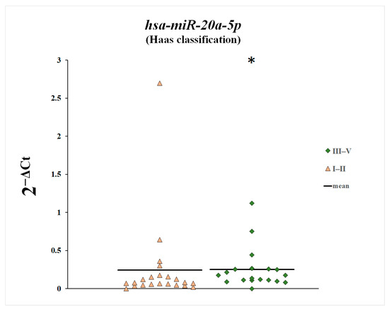 Plasma levels of miR-20a-5p in patients with histopathological changes classified as Stage 1 and 2 according to the Haas classification and in patients with Stages 3, 4, and 5, * p = 0.03, Mann–Whitney U test.