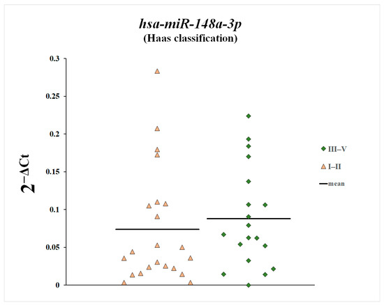 We also compared plasma levels of miR-148a-3p, miR-425-3p, and miR-20a-5p between patients with histopathological changes classified as Stage 1 and 2 according to the Haas classification and patients with Stages 3, 4, and 5 (Figure 7, Figure 8 and Figure 9). Plasma levels of miR-20a-5p were statistically significantly increased in patients with histopathological changes classified as Stages 3, 4, and 5 according to the Haas classification compared with patients with histopathological changes classified as Stages 1 and 2.