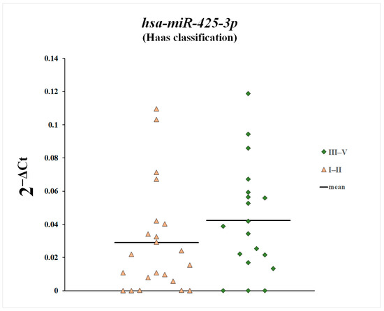 Plasma levels of miR-425-3p in patients with histopathological changes classified as Stage 1 and 2 according to the Haas classification and in patients with Stages 3, 4, and 5.
