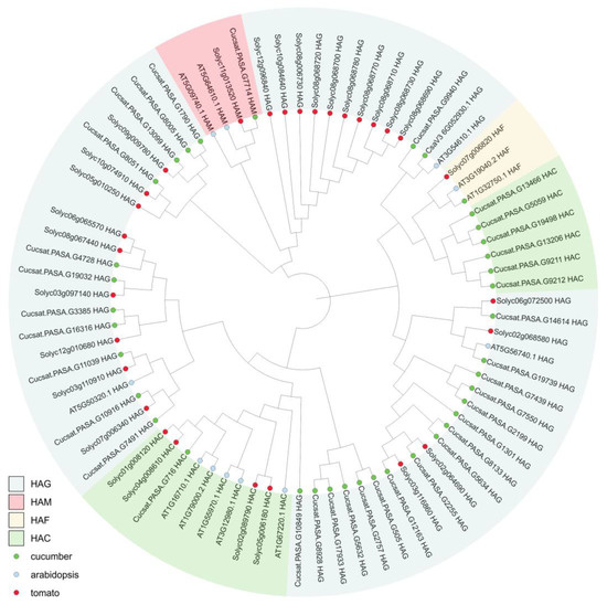 Phylogenetic analysis of HAT proteins from Cucumis sativus (36 proteins, indicated by green circles), Arabidopsis thaliana (12 proteins, indicated by blue circles), and Solanum lycopersicum (29 proteins, indicated by red circles). The phylogenetic tree was built using the neighbor-joining method. The HAG, HAM, HAF, and HAC families have been marked with different colors.