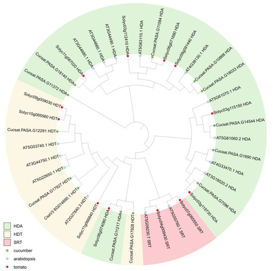 Phylogenetic analysis of HDAC proteins from Cucumis sativus (12 proteins, indicated by green circles), Arabidopsis thaliana (15 proteins, marked with blue circles), and Solanum lycopersicum (12 proteins, marked with red circles). The phylogenetic tree was built using the neighbor-joining method. The HDA, HDT, and SRT families were indicated by different colors.