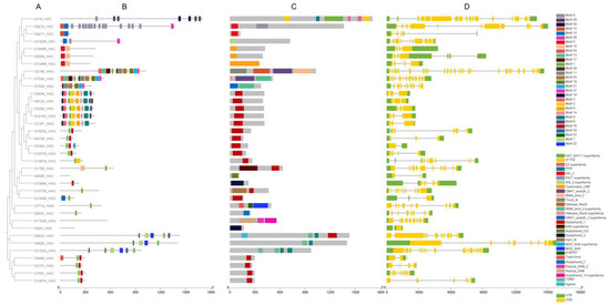 For a better understanding of the structural diversity of the CsHAT and CsHDAC families, we identified and analyzed the conserved motifs using the MEME tool and analyzed the occurrence of conserved protein domains with InterProScan. We identified 30 conserved motifs in the CsHAT proteins, ranging from 7 aa to 50 aa in length, and 30 protein domains from the Pfam database (Figure 3). There is no clear pattern for each HAT class in terms of the predicted motifs. However, the proteins that clustered together on the same branches of the phylogenetic tree showed a similar motif distribution. For example, HAC family proteins G19498, G5059, and G13466 consist only of motif 5 and motif 10, which are related to the occurrence of the KIX domain, a coactivator of CBP, found only in these three proteins. Another group is the HAG family proteins G5634, G8133, G2255, G12163, and G1301, which showed a similar composition of conserved motifs, which are motifs 1–4, 8–9, 14, and 19. Motif 1 was found in 24 CsHAT proteins. This motif is most likely related to the occurrence of the acetyltransferase 1 domain.