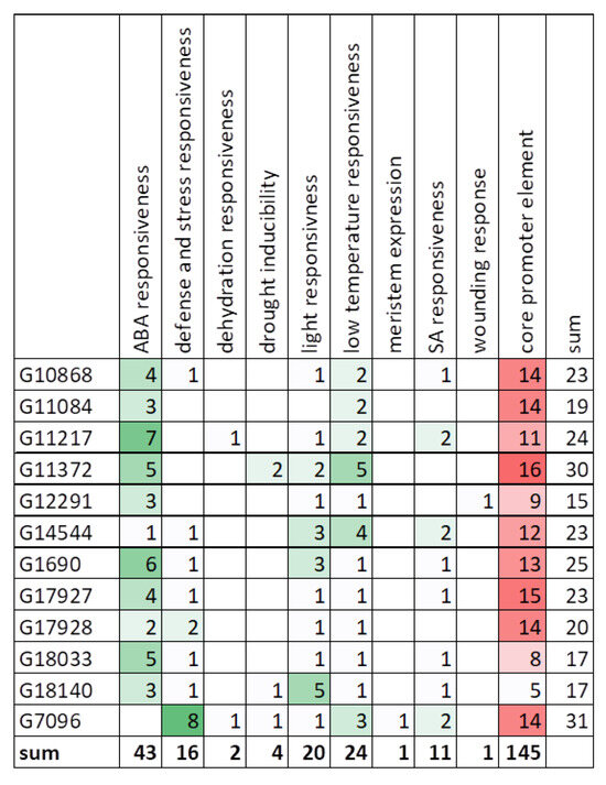 The analysis of the promoter regions of CsHDACs showed that cis-acting elements involved in ABA responsiveness were also most abundant in these genes (Figure 11). They accounted for 35.2% of all cis-elements found (excluding core promoter elements). The next highly represented groups were elements involved in low-temperature responsiveness (19.7% of all elements) and light responsiveness elements (16.4%) (Figure 12).