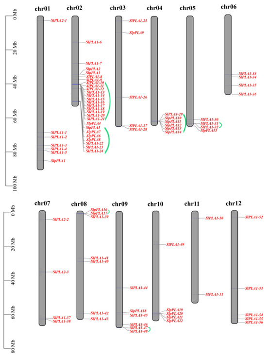Chromosomal positioning of PLA genes in tomato. The gray bar structure signifies the chromosome. The chromosome number is located above the chromosome and displayed in black font. The PLA genes were represented in red font and located on the right side of the chromosome, with tandem repeat genes connected with a green line. The scale bar located on the left side of the figure represents the length of chromosomes in millions of bases (Mb).