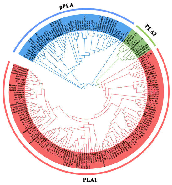 Phylogenetic tree of PLAs from tomato, Arabidopsis, and maize. Multiple sequence alignment was performed on the amino acid sequences of 185 PLA in Arabidopsis, rice, and tomato. The phylogenetic tree was constructed with MEGA11.0 software using the ML method with 2000 bootstrap replications. Red/green/blue represent PLA1/PLA2/pPLA group, respectively.