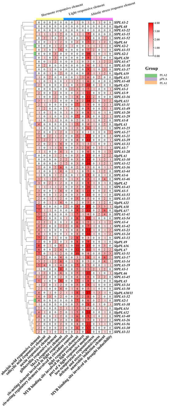 Analysis of cis-acting elements in the promoter region of the SlPLA gene family. At the top of the heat map, various colors are used to distinguish the overall categories of cis-acting elements, such as ABA, MeJA, and IAA, all of which are classified as hormone-response elements. Each box contains the number of cis-acting elements. The intensity of the box’s color is directly proportional to the number of components it encompasses.