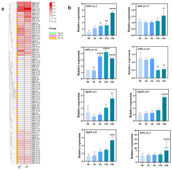Expression analysis of SlPLA genes under low-temperature stress. (a) Expression profile of SlPLA genes under low-temperature conditions. Heat maps were presented in red/pink/white colors that represent high/medium/low expression, respectively. (b) qRT-PCR analysis of representative SlPLA genes under low-temperature conditions (0 h, 3 h, 6 h, 12 h, and 24 h). We used 0 h as the control for cold stress treatment, with its relative expression set at 1. The “ns” indicates that the difference between the groups is not statistically significant. * p < 0.05, ** p < 0.01, *** p < 0.001, **** p < 0.0001.