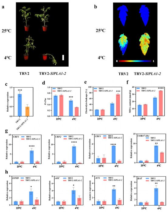 Silencing SlPLA1-2 with VIGS heightened the tomato plants’ sensitivity to cold stress. (a) Phenotypes of TRV2 and TRV2-SlPLA1-2 tomato plant after exposure to 25 or 4 °C for 7 days. (b) Fv/Fm in TRV2 and TRV2-SlPLA1-2 tomato leaves after exposure to 25 or 4 °C for 7 days. The false color code depicted at the bottom of the image ranges from 0 (black) to 1.0 (purple), representing the level of damage in the leaves. (c) qRT-PCR analysis of the relative expression levels of SlPLA1-2 in the silenced plant (TRV2-SlPLA1-2) and control (TRV2) plant. (d) The Photosynthetic Capacity (Fv/Fm) in TRV2-SlPLA1-2 tomato leaves after exposure to 25 or 4 °C for 7 days. (e) The relative electrolyte leakage in TRV2, and TRV2-SlPLA1-2 tomato leaves after exposure to 25 or 4 °C for 7 days. (f) The MDA content in TRV2-SlPLA1-2 tomato leaves after exposure to 25 or 4 °C for 7 days. (g) Relative transcript levels of SlCBF1, SlCBF2, SlCBF3, and COR47-like in TRV2 and TRV2-SlPLA1-2 tomato plant after exposure to 25 or 4 °C. (h) Relative transcript levels of LOXD, AOC, ACX, and KAT in TRV2, and TRV2-SlPLA1-2 tomato plant after exposure to 25 or 4 °C. * p < 0.05, ** p < 0.01, *** p < 0.001, **** p < 0.0001.
