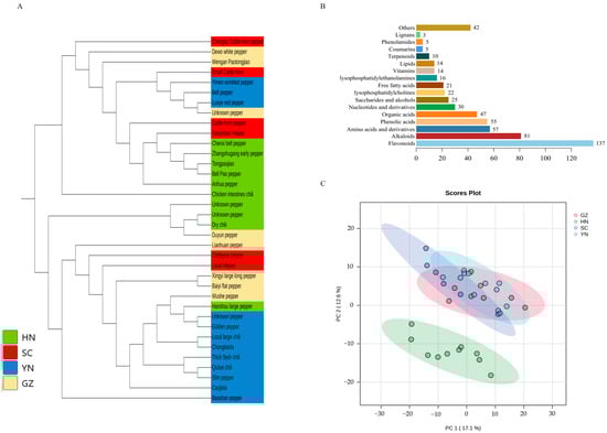 Genome and metabolome analyses. (A): The neighbor joining tree of 36 pepper accessions. (B): The classification of 584 metabolites. (C): Principal component analysis of pepper metabolites from four provinces (HN-Hunan; SC-Sichuan; YN-Yunnan; GZ-Guizhou).