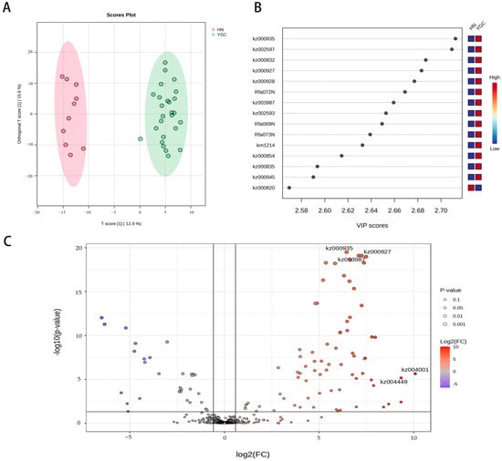 Metabolites analyses of pepper accessions from Hunan and Yun_Gui_Chuan Groups. (A): oPLS-DA score chart; (B): oPLS-DA VIP score chart; (C): volcano plot.