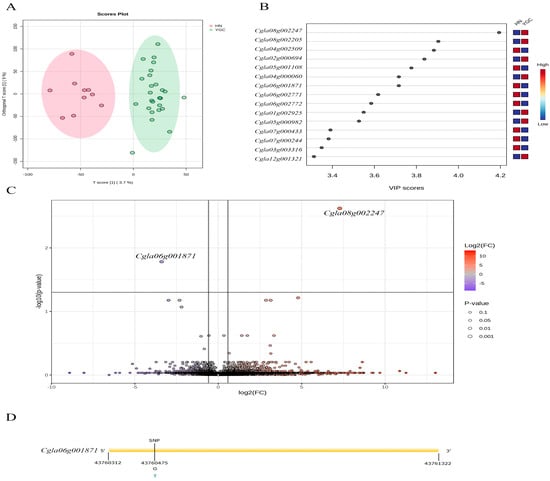 Hunan (HN) Group and Yun_Gui_Chuan(YGC) Group transcriptome analyses. (A): oPLS-DA score chart; (B): oPLS-DA VIP score chart; (C) volcano plot; (D): the structure of Cgla06g001871 and the SNP position.
