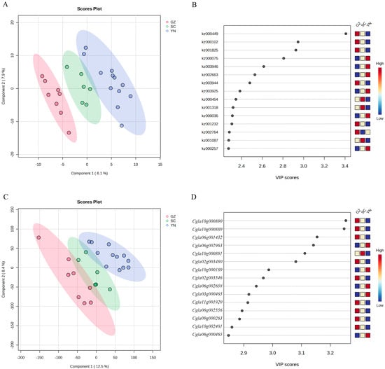 Yunnan, Guizhou and Sichuan pepper accessions transcriptome and metabolome analyses. (A): Metabolome PLS-DA score chart; (B): Metabolome PLS-DA VIP score chart (C): Gene PLS-DA score chart (D): Gene PLS-DA VIP score chart.