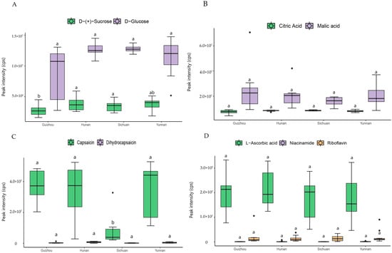 Analyses of taste and nutrition metabolites among Yunnan, Guizhou Sichuan and Hunan province (A): sugars; (B): acids; (C): capsaicinoids; (D): vitamins. (Identical lowercase letters indicate no significant difference at the 0.05 level.) Unit: count per second (cps).