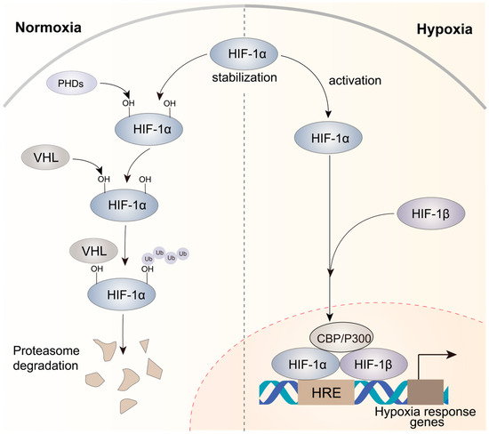 The microenvironment of solid tumors often exhibits hypoxia, which results from unrestrained and rapid tumor cell growth that limits the availability of oxygen [38]. HIFs are crucial for hypoxic responses [39], and increased HIF levels are frequently linked to a poor prognosis in various tumor types [40,41]. HIFs are heterodimeric proteins comprising a constantly expressed subunit (HIF-1β) and an oxygen-sensitive subunit (HIF-1α, HIF-2α, or HIF-3α). Under normal oxygen conditions, the HIF-1α subunit undergoes hydroxylation by dioxygenases called PHD1, PHD2, and PHD3. Subsequently, the hydroxylated prolines (PHDs) are recognized by the von Hippel–Lindau (VHL) E3 ubiquitin ligase, resulting in the ubiquitination of HIF-1α (Figure 1). However, under hypoxic conditions, PHDs cannot use oxygen as their co-substrate, resulting in the inhibition of hydroxylation. This inhibition leads to the accumulation of non-hydroxylated HIF-α subunits, which eventually translocate to the nucleus (Figure 1). In the nucleus, a heterodimeric complex consisting of HIF-1α and HIF-1β binds to hypoxia-responsive elements (HREs) on the promoters of hypoxia-responsive genes and drives the transcriptional activation of target genes after the recruitment of CBP/P300, a co-activator [42,43]. This process initiates a sequential cascade of cellular adaptations to hypoxia, encompassing amplified cell proliferation and angiogenesis, diminished apoptosis, and increased invasion and metastasis.
