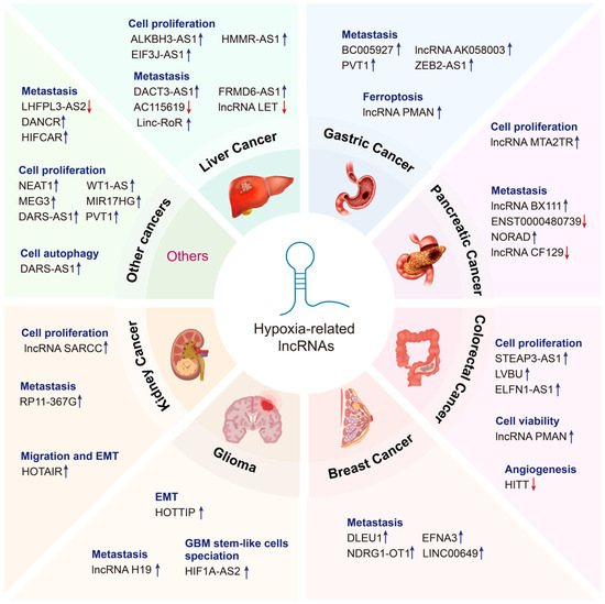 Emerging roles of hypoxia-related lncRNAs in cancer. Hypoxia-related lncRNAs perform diverse functions in various cancer types, including liver cancer, gastric cancer, pancreatic cancer, colorectal cancer, breast cancer, glioma, kidney cancer, and so on. Upregulated lncRNAs are indicated by the blue arrow, whereas downregulated lncRNAs are indicated by the red arrow.