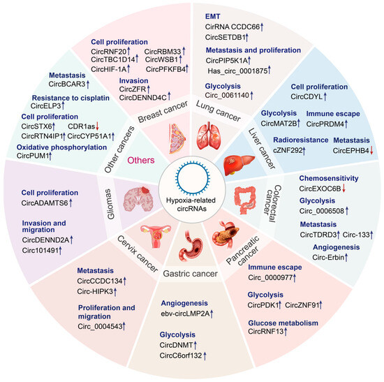 Emerging roles of hypoxia-related circRNAs in cancers. Hypoxia-related circRNAs perform diverse functions in various cancer types, including lung cancer, liver cancer, colorectal cancer, pancreatic cancer, gastric cancer, cervical cancer, glioma, and so on. Upregulated circRNAs are indicated by the blue arrow, whereas downregulated circRNAs are indicated by the red arrow.