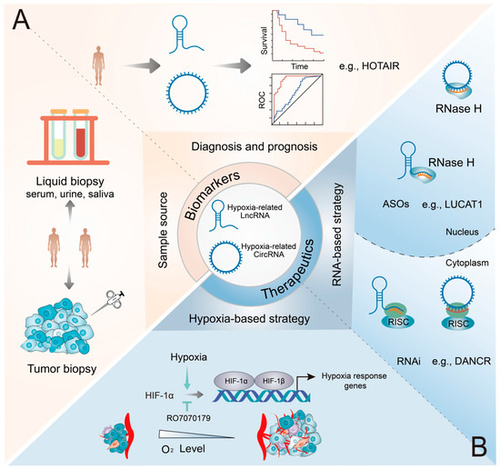 Potential applications of hypoxia-related lncRNAs and circRNAs as biomarkers and therapeutic targets in cancers. (A) Diagnostic potential of hypoxic ncRNAs. These ncRNAs can be reliably detected in a diverse range of biospecimens, encompassing both conventional tumor biopsy samples and liquid biopsy samples (such as blood and urine). (B) Therapeutic potential of hypoxic ncRNAs. Inhibitors effectively modulate the expression and function of HIF-1α, while RNAi and ASO therapies underscore the precise targeting prowess of ncRNAs, specifically in the cytoplasm and nucleus, respectively.
