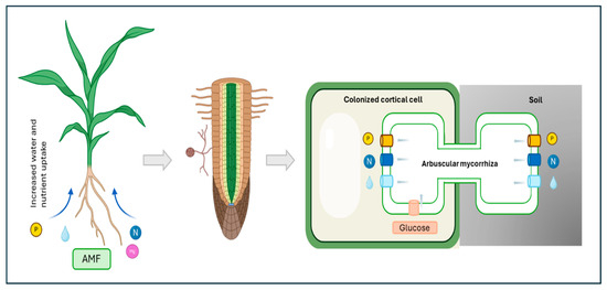 Arbuscular mycorrhizal fungi (AMF) are obligate biotrophic organisms that belong to the Glomeromycota phylum. These fungi form one of the most widespread symbiotic associations with plant roots [3]. This ancient symbiosis is characterized by a complex molecular dialogue between the plant and the fungus, leading to the formation of specialized structures within plant roots. These structures, known as arbuscules, serve as the primary site for nutrient exchange [4]. AMF enhance plant nutrient uptake, particularly phosphorus and nitrogen, and improve plant tolerance to various biotic and abiotic stresses. In return, plants provide carbon-based compounds to the fungi (Figure 1).